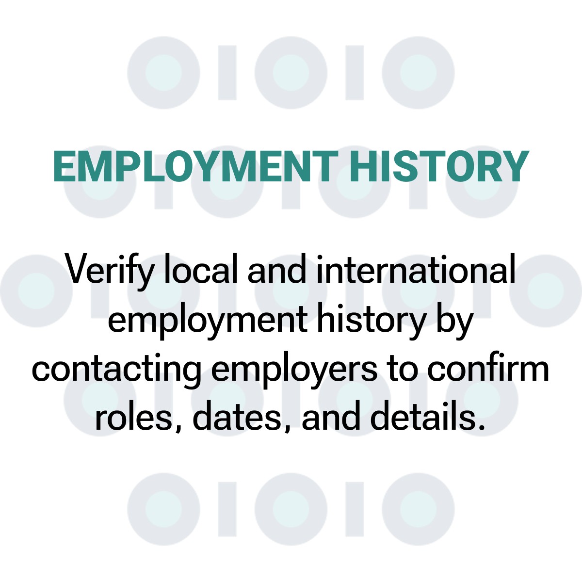 Verify local and international employment history by contacting employers to confirm roles, dates, and details.