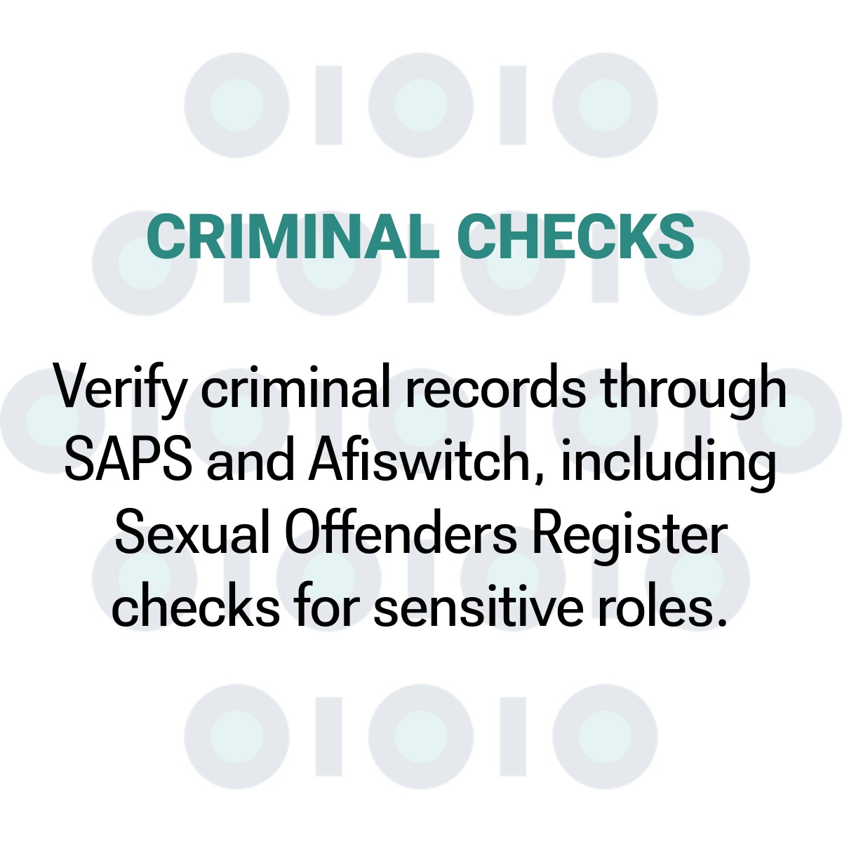 Verify criminal records through SAPS and Afiswitch, including Sexual Offenders Register checks for sensitive roles.