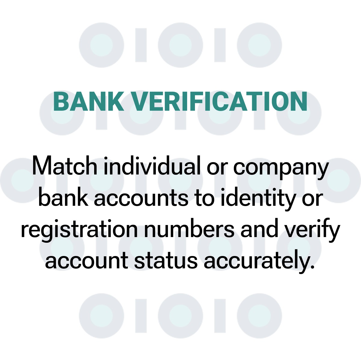 Match individual or company bank accounts to identity or registration numbers and verify account status accurately.