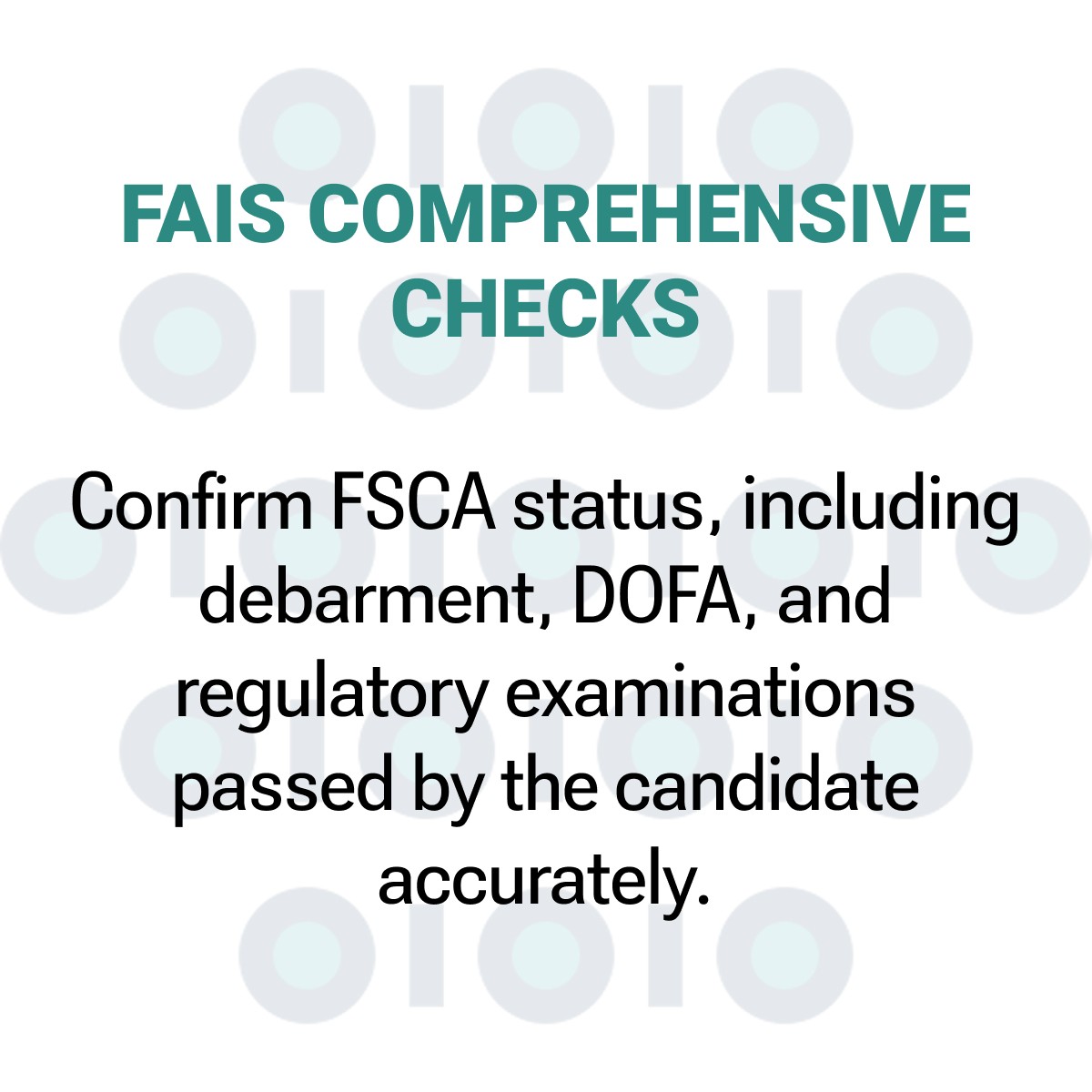 Confirm FSCA status, including debarment, DOFA, and regulatory examinations passed by the candidate accurately.