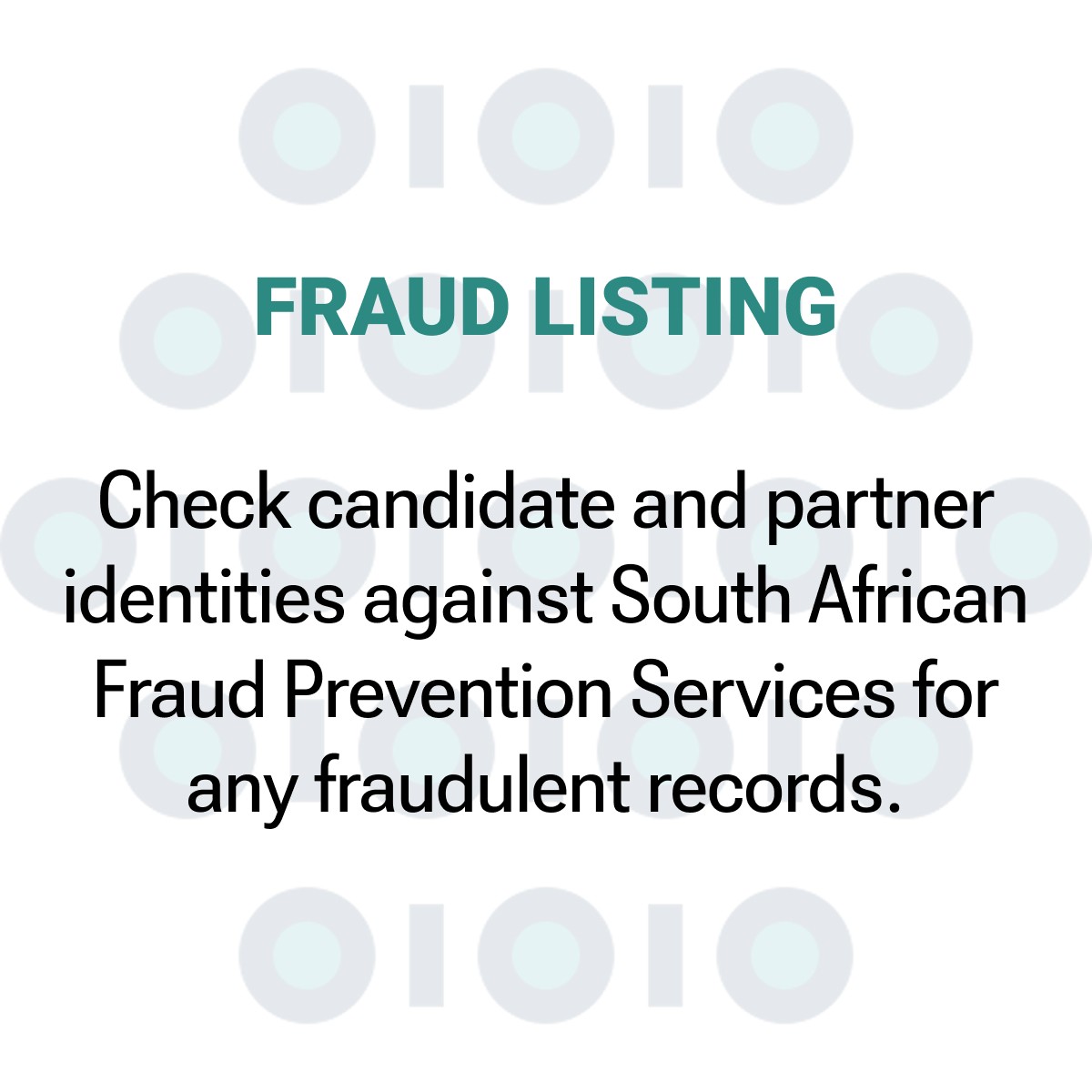 Check candidate and partner identities against South African Fraud Prevention Services for any fraudulent records.