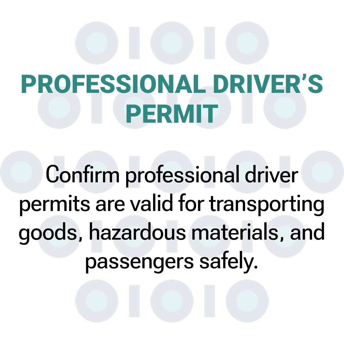 Confirm professional driver permits are valid for transporting goods, hazardous materials, and passengers safely.